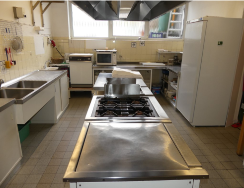 Große Gemeinschaftsküche — Voll ausgestattet mit Herd, Backofen, Mikrowelle, Kühlschrank und allem Notwendigen für die tägliche Selbstverpflegung. Ideal für Monteure auf Langzeiteinsatz.